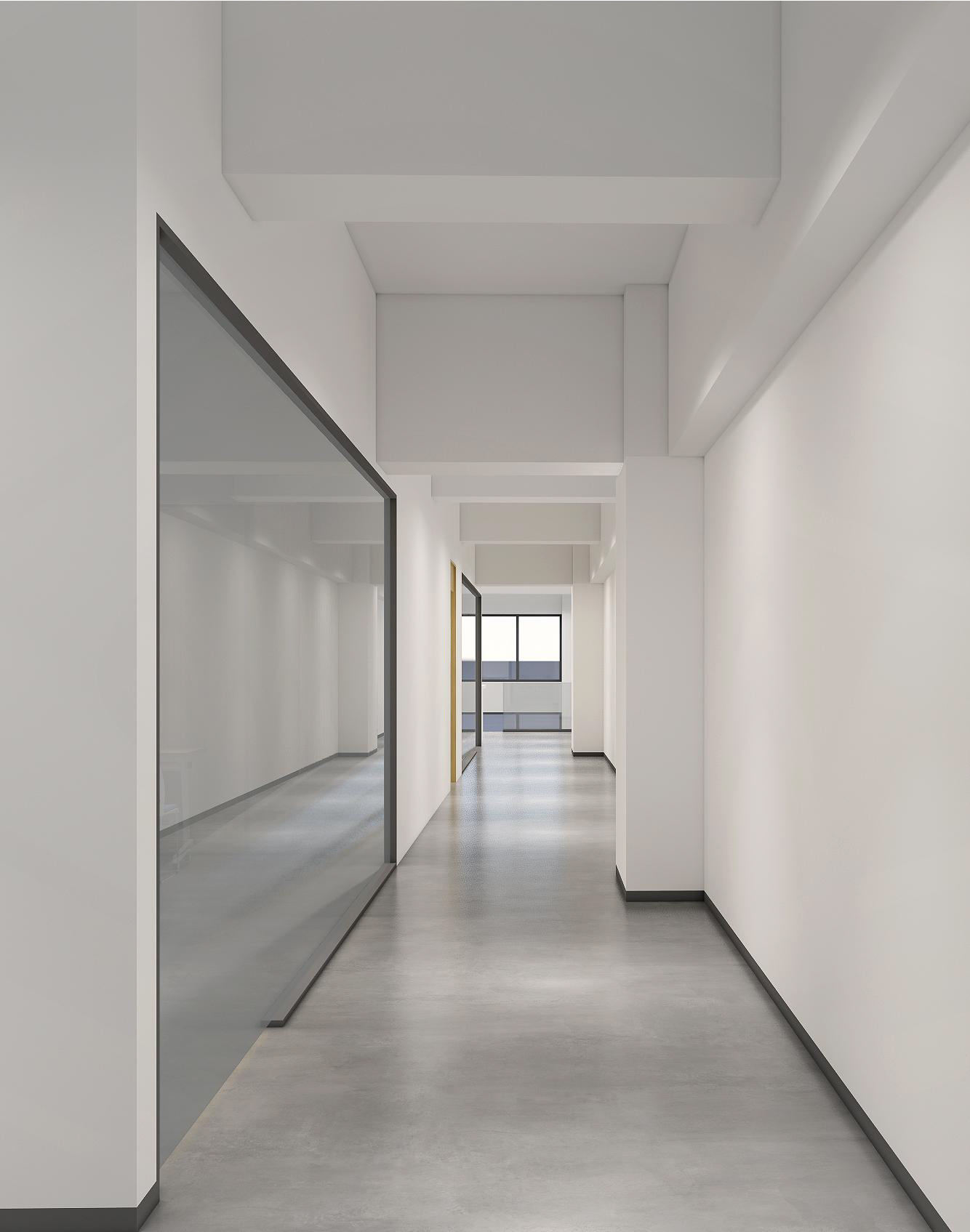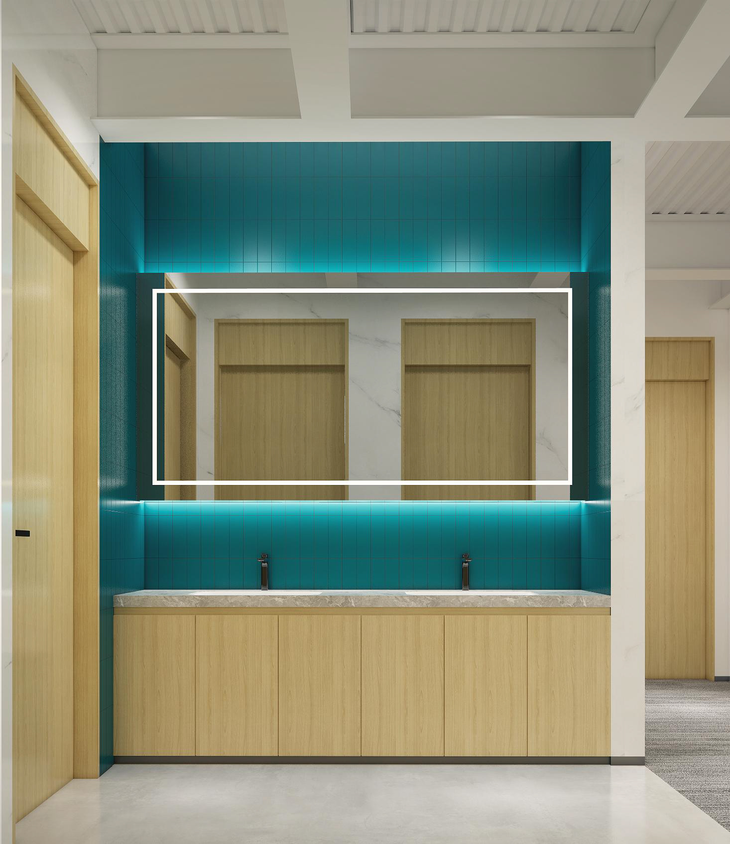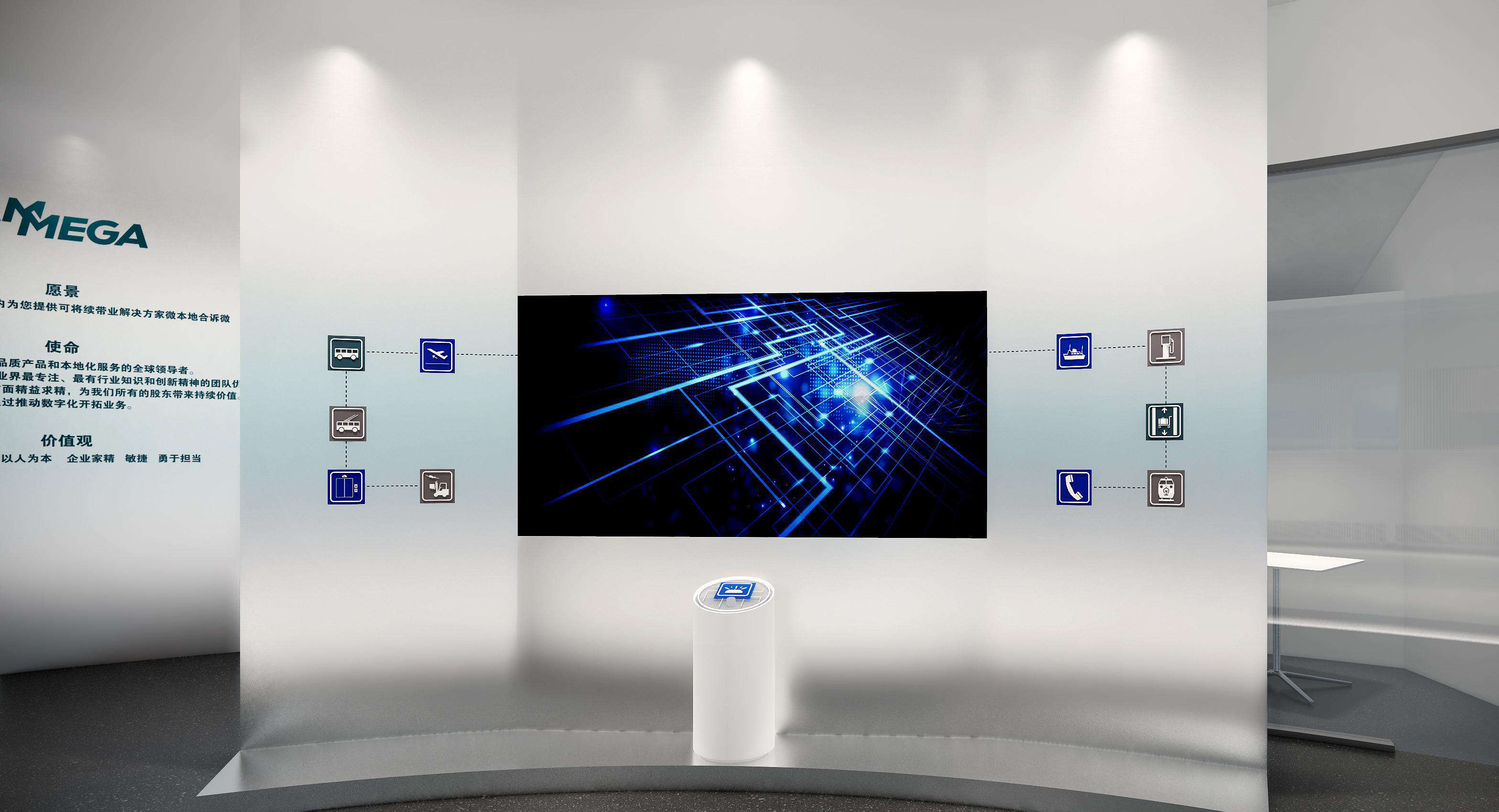 墻面幾何線條的使用,突出現(xiàn)代感,同時增加動感。冷色調墻面強調科技感,開放式布局,空間更加通透、流動。