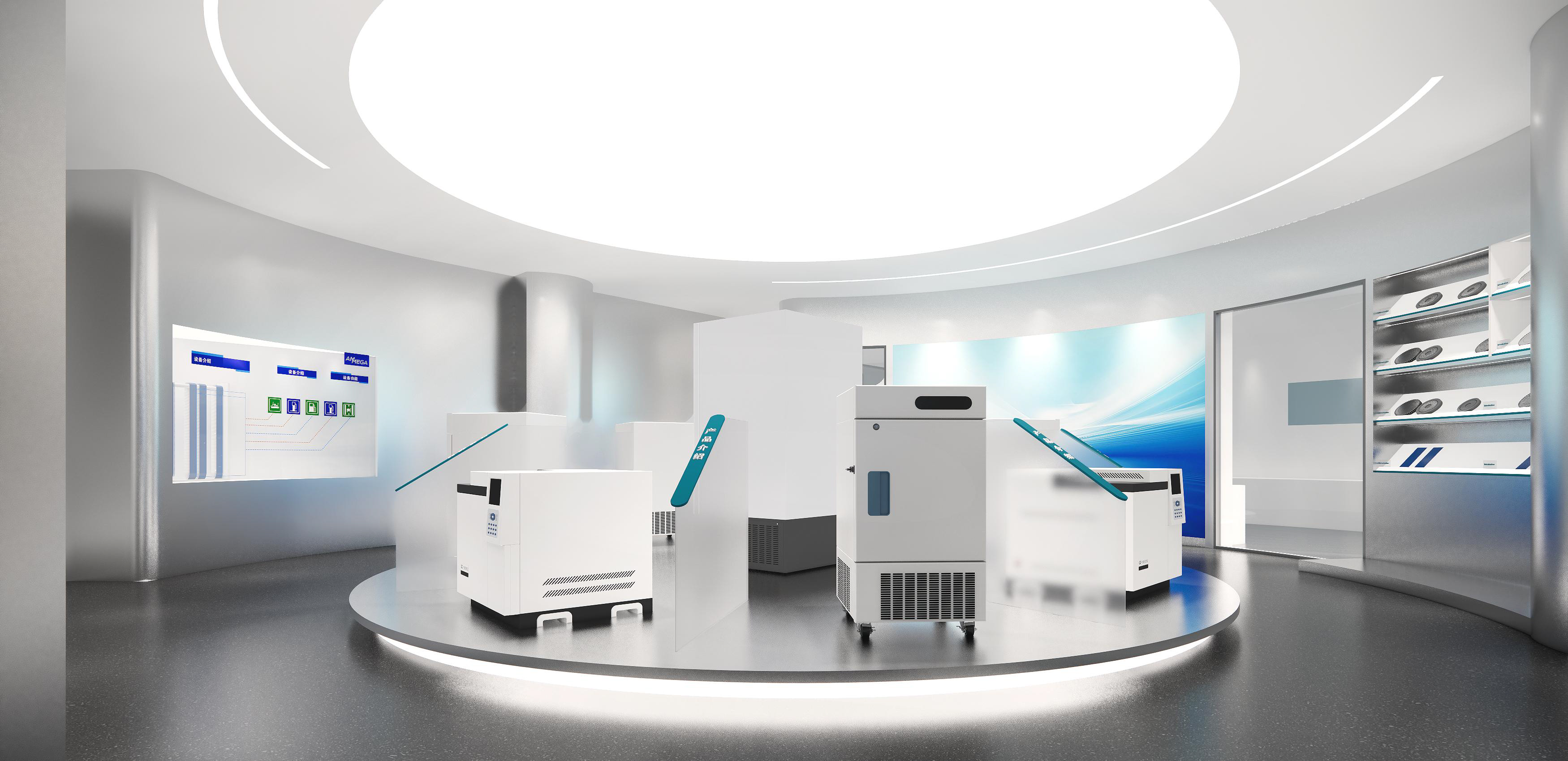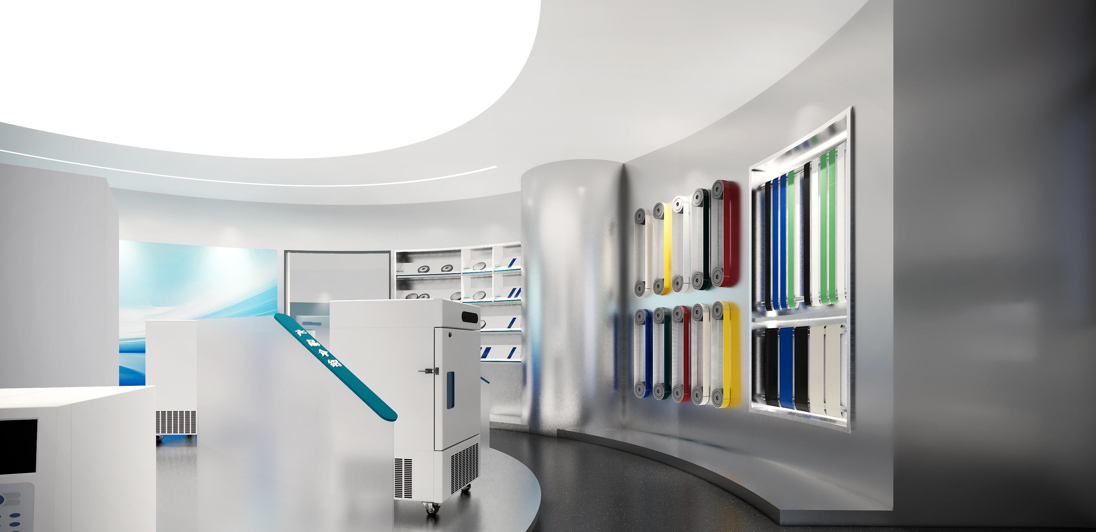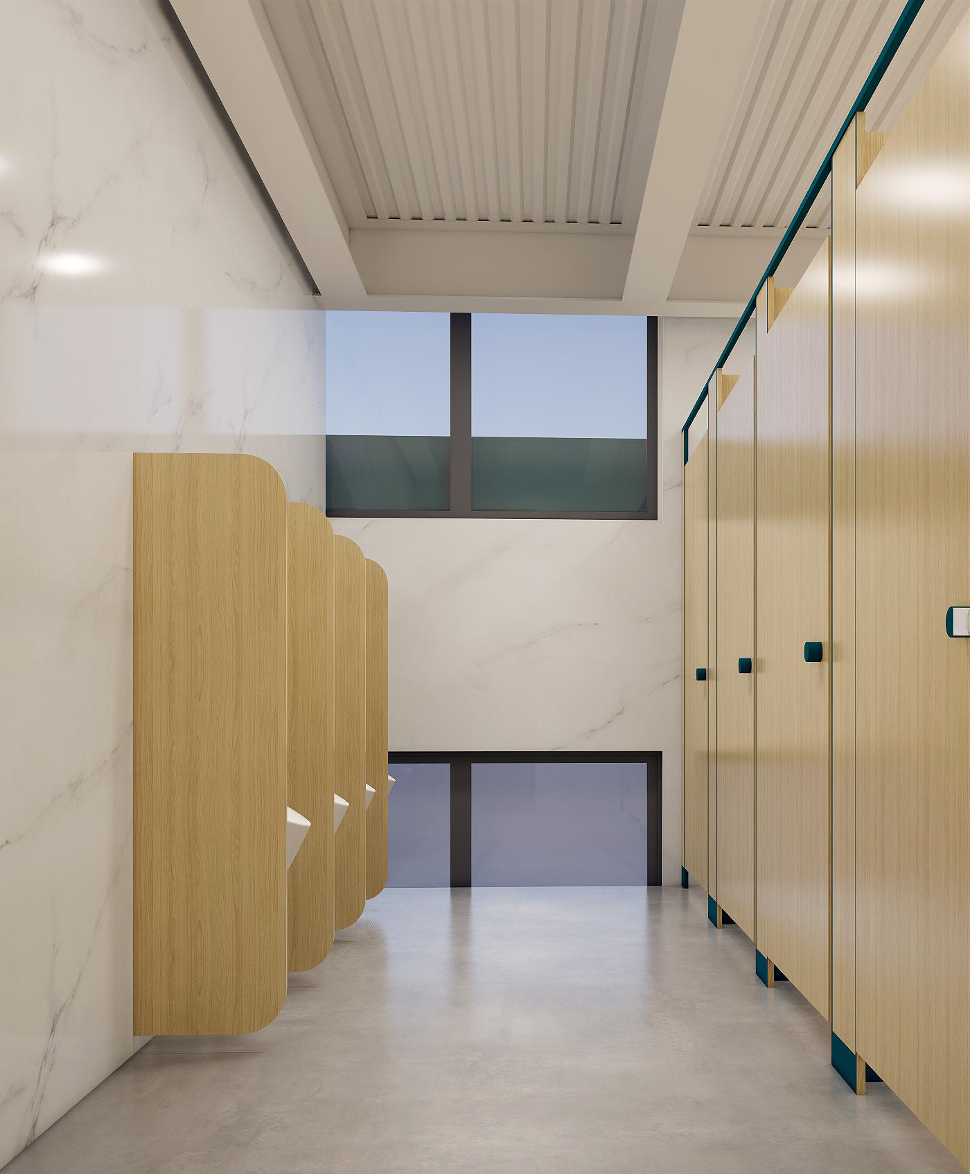 墻面幾何線條的使用,突出現(xiàn)代感,同時增加動感。冷色調墻面強調科技感,開放式布局,空間更加通透、流動。