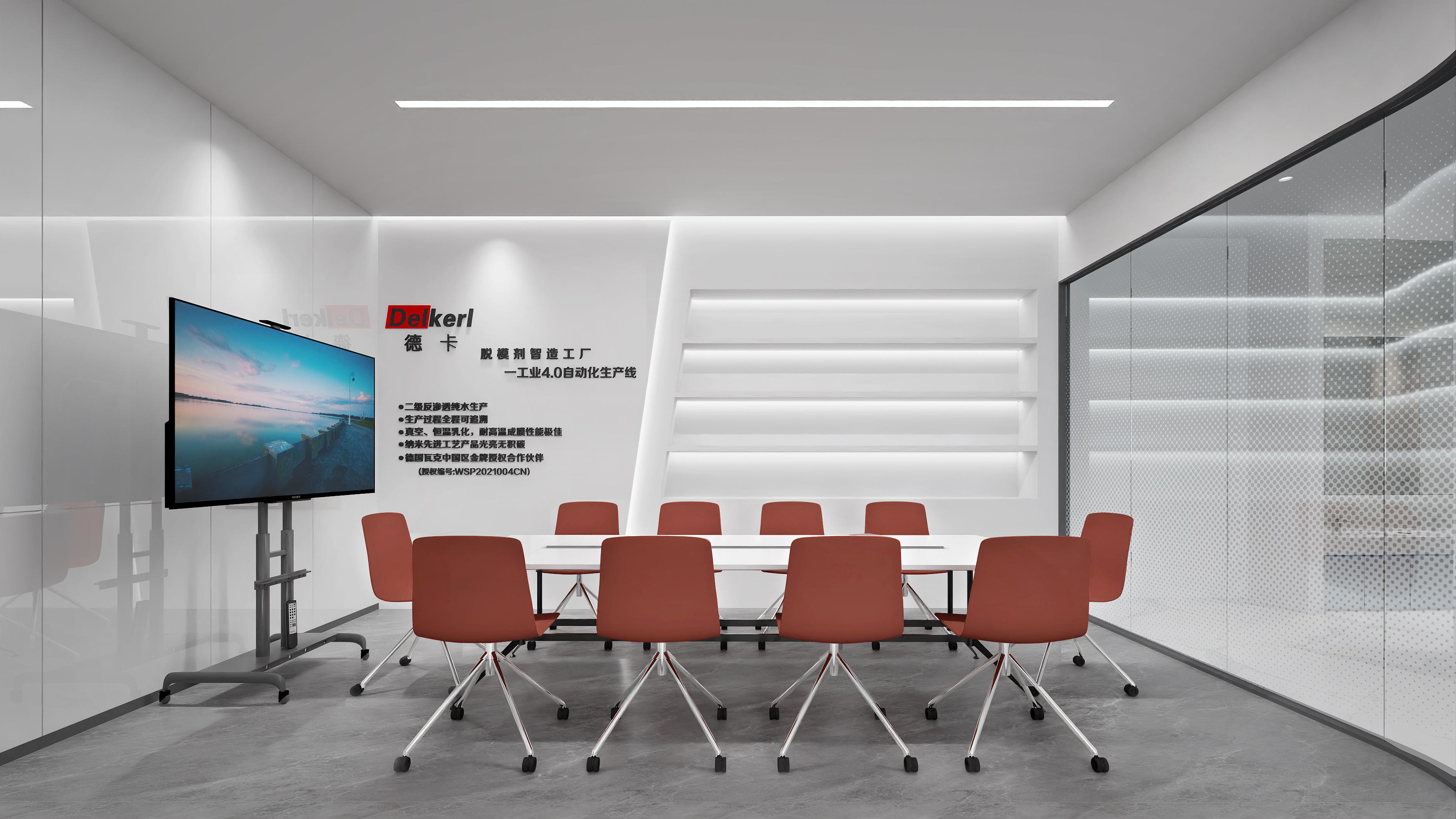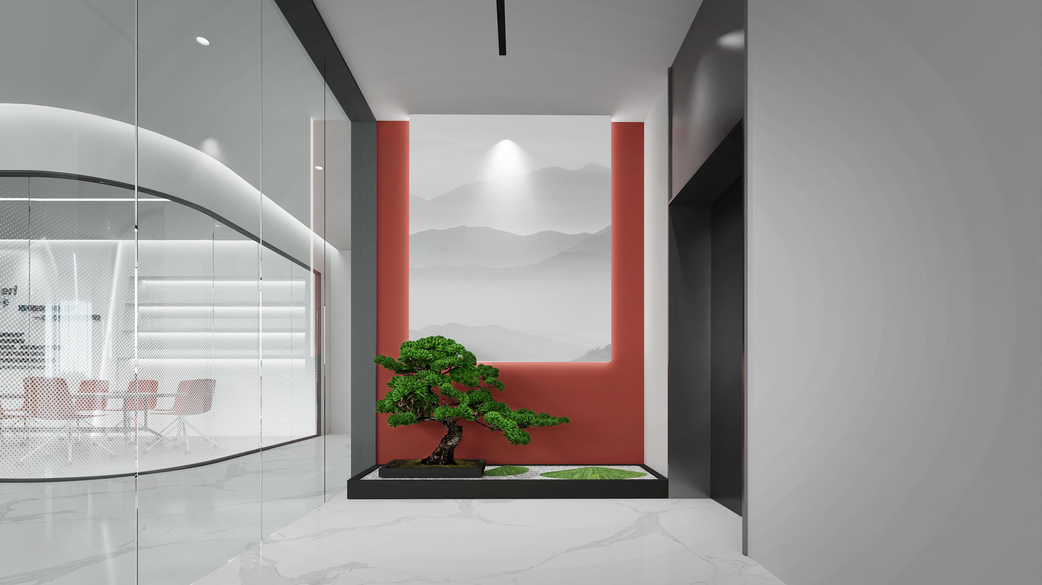 logo墻簡潔明了,節省空間,綠植和墻壁相互映襯,沉穩大氣。整體以灰色調為主,打造簡約風格的同時突出科技感。總經理辦公室中式家具以及其他裝飾物的搭配使用,突顯公司品味。