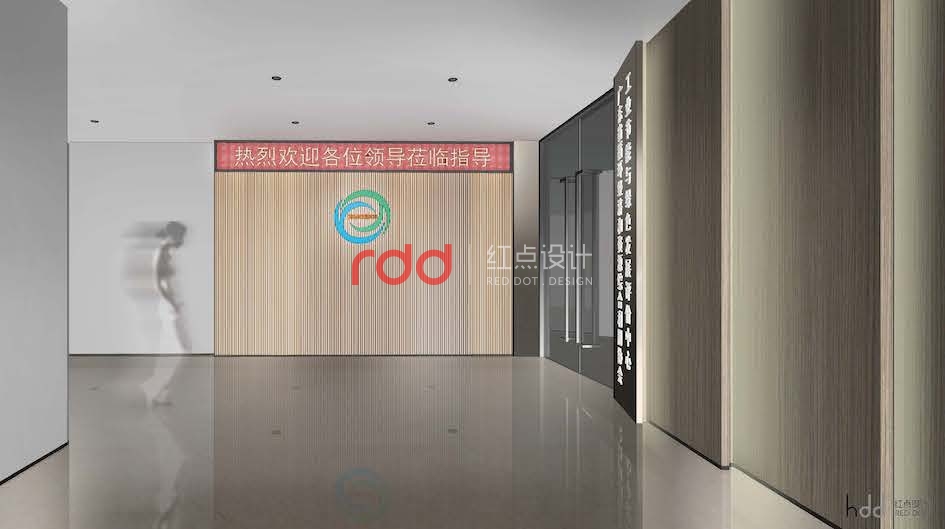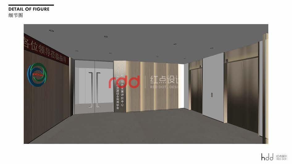 設計師利用“一空間多用的”的特點,把電梯間作為該單位的形象宣傳區域。進入電梯間,藍與綠雙環保型結構的logo在再生木背景墻的映襯下突出醒目,靠近門的區域使用層層跌級結構,與環保型logo相呼應。