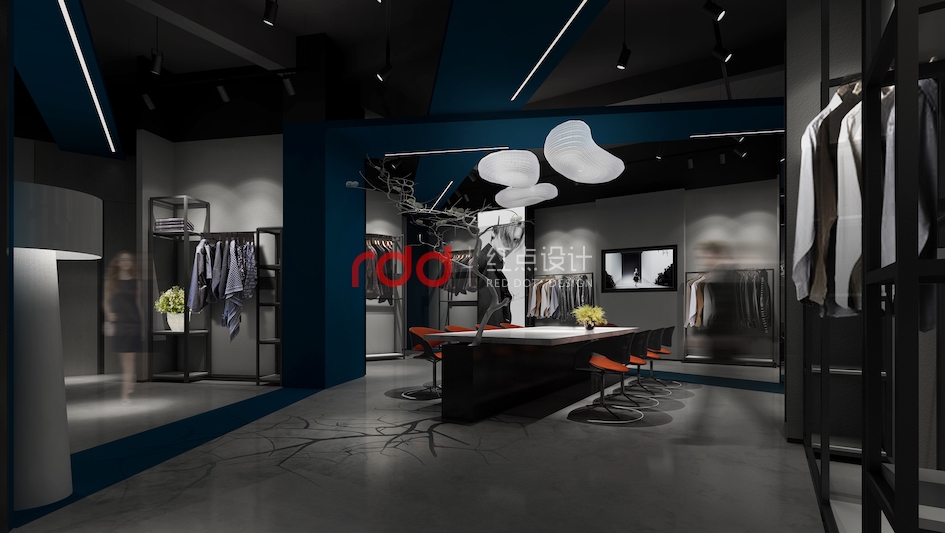 由于是男裝的展廳,整個展廳以灰色為基調,寶藍色的造型如絲帶從地面一直延伸到天花,錯落有致。