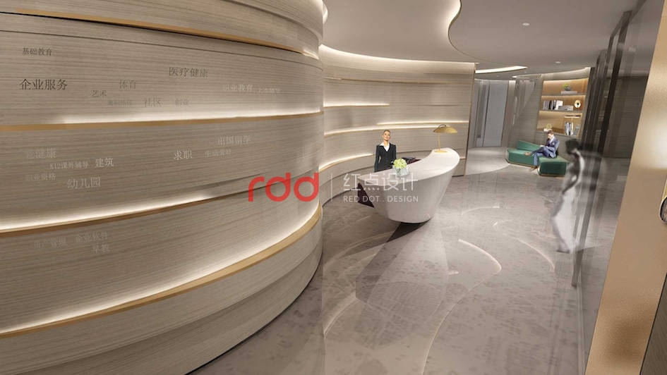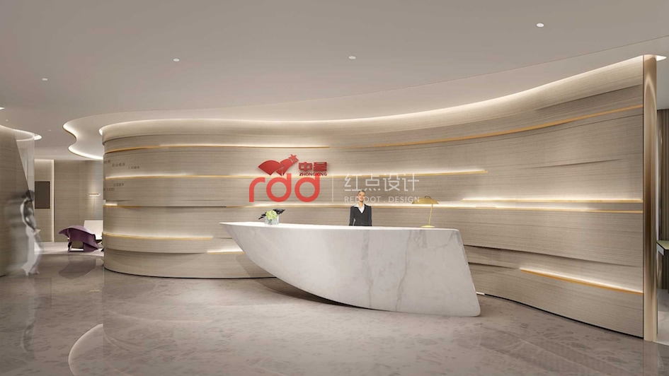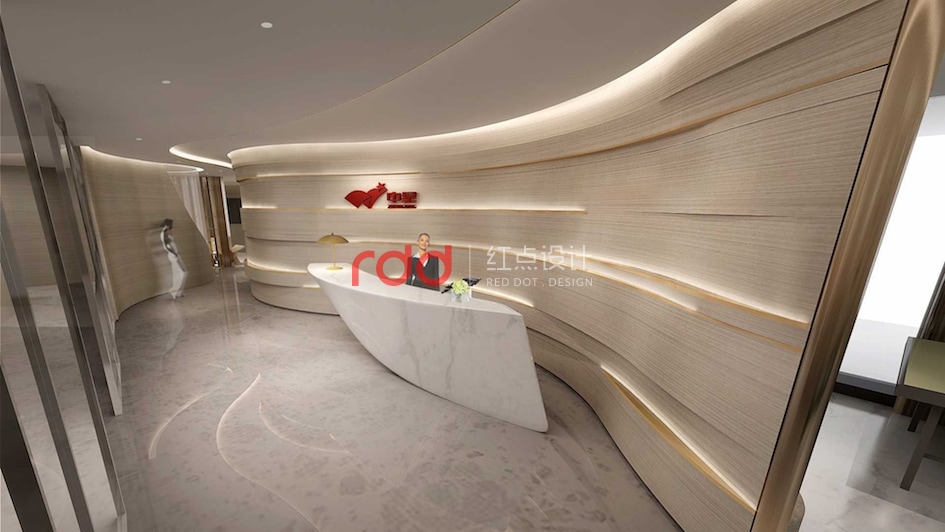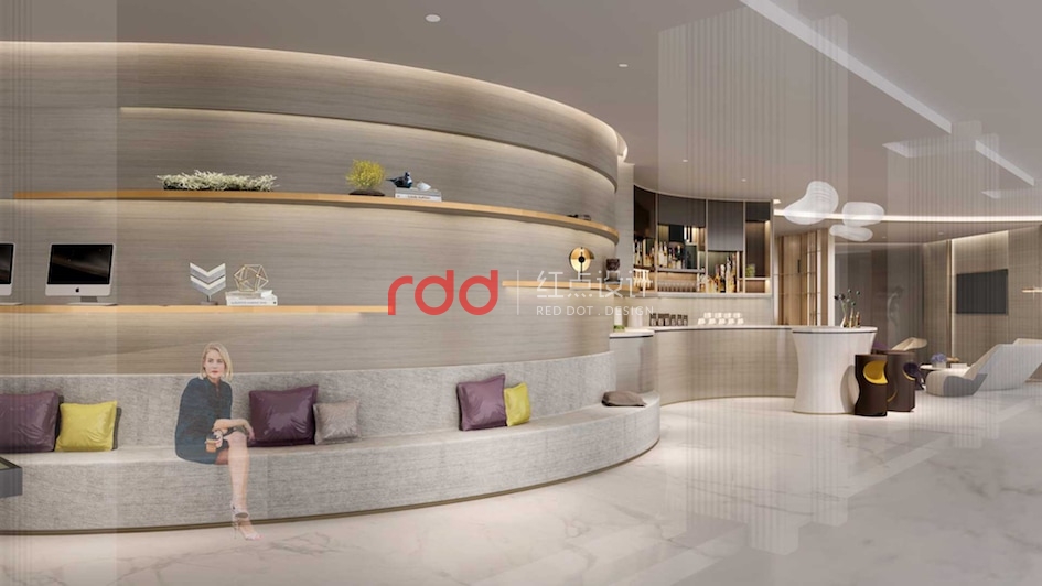 前臺背景設(shè)計師運用重復(fù)的線條,以及曲線的表現(xiàn)形式和金屬的包邊,加上靈活運用重復(fù)、漸變等美學(xué)法則使前臺背景的造型充滿詩意和富于裝飾性,結(jié)合弧形的吧臺及沙發(fā),宛若蛟龍騰空而起。