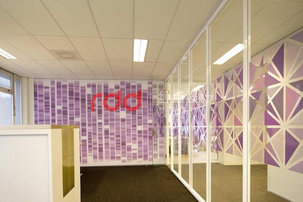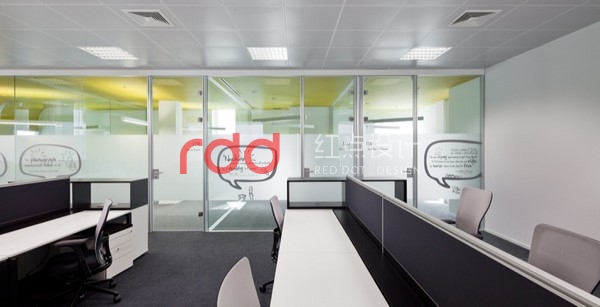 IT行業給人的印象是硬朗的,為了打破這樣的固定思維模式,紅點裝飾的設計師運用黃色及紫色比較柔和的色彩來改變空間的氛圍。線條交錯的白色鏤空隔斷圍合,形成相對獨立的空間。