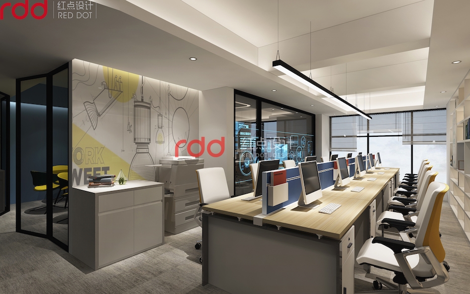 科學技術是第一生產力。在科技日新月異的今天,科技占據了主導地位。而作為一家科技公司,工作環境也是非常重要的,辦公空間以白色為基調,利用黃色的辦公椅和寶藍色辦公桌上的擋板,柜子上天藍色點綴,活躍空間的氛圍。