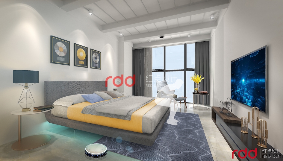 藍色強調科技、效率,表現出一種美麗、冷靜、理智、安詳與廣闊。因此在休閑和接待室,用藍色的線條、色塊來作點綴,結合燈光的效果,突出空間的科技感。