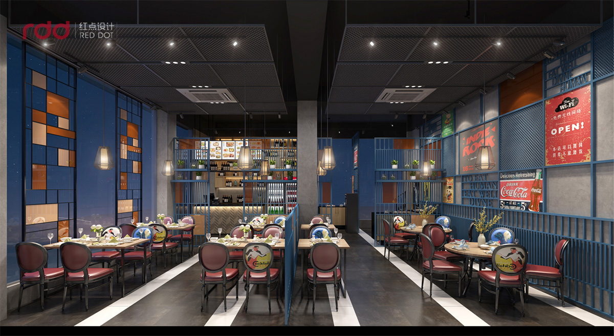 本項目的私房菜設計,紅點裝飾的設計師運用工業風與蒙德里安紅黃藍的經典構圖的的碰撞。根據蒙德里安直線與橫線的構圖原則,室內全部運用直線與橫線的穿插結構,前臺是淺色木飾面與黑色不銹鋼的搭配,加上素水泥的墻面,在暖黃的燈光下,有一種純粹而溫暖的感覺。