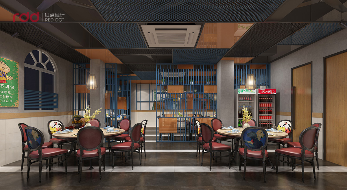 進入用餐區,紅黃藍三種顏色盡收眼底,藍色的格柵從天花一直延伸到立面,疏密有致的線條既分開了空間區域又增加了靈動性。酒紅色的椅子和淺木色的搭配,添了幾分古典的意味。椅子上、墻上、隔斷上的畫和標語,使這個方正的空間多了一絲幽默感。