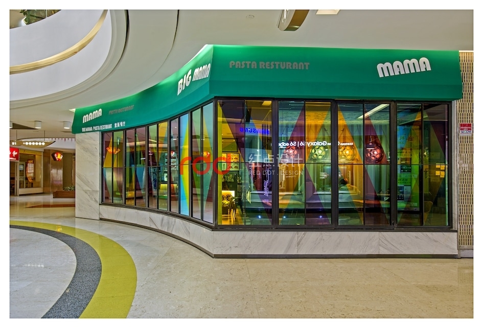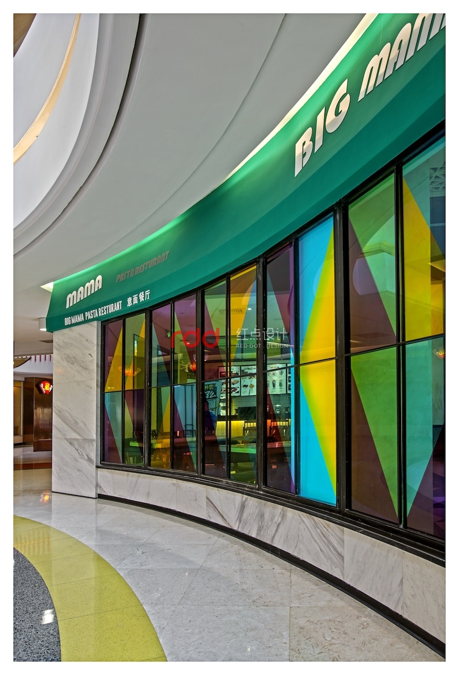 流光溢彩的外立面劃出一道弧線,配上多彩的玻璃窗像極一道炫目的虹。哪怕只是路過,驚鴻一瞥間也能讀出這里洋溢的別致、時尚與異域風情。通透度極高的彩色玻璃,如同眼下時髦的濾鏡,為空間染上了別樣繽紛。紅黃藍綠四色被現代主義手法所重構,隨機組合成了色彩鮮艷明麗的所在。設計師為該餐廳引入了不少電影元素,從門口的老舊放映機到內部的膠卷盤壁燈,復古的年代感就像大餐中的一小撮海鹽,于時光交錯間,將時尚與摩登烘托得淋漓盡致。