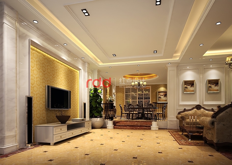 進入客廳,簡歐造型柱及圓形吊頂,復古風格瓷磚一直延伸到客廳及餐廳,帶有西方復古圖案,線條簡單優雅的歐式家具,鐵藝欄桿給空間增添歐式風情。