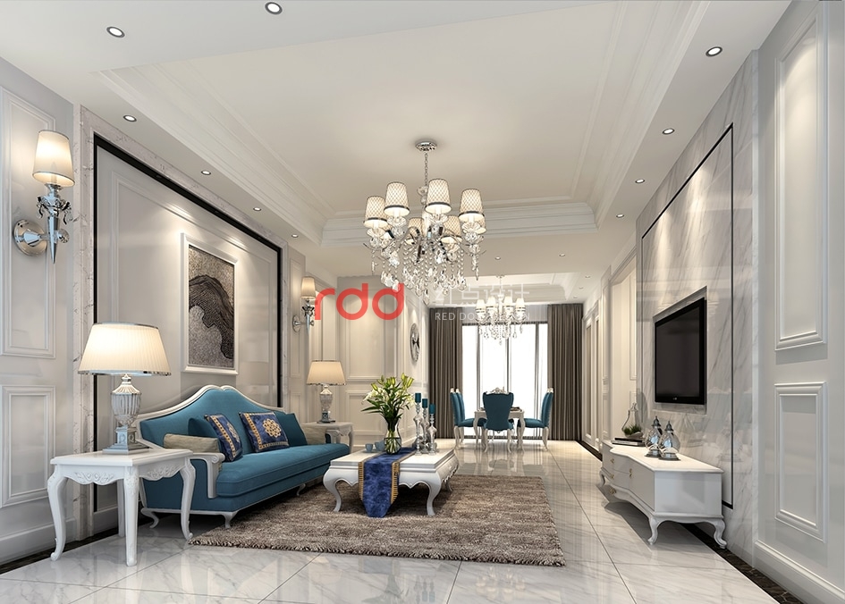 簡約、質(zhì)樸的設(shè)計(jì)風(fēng)格是眾多人群所喜愛的,生活在繁雜多變的世界里已是煩擾不休,而簡單、自然的生活空間卻能讓人身心舒暢,感到寧靜和安逸。因此,本案設(shè)計(jì)師以白色為基調(diào),客廳爵士白大理石的電視背景墻及地面,噴白漆的歐式裝飾線墻面,藍(lán)色的沙發(fā)及餐桌椅作點(diǎn)綴,在灑著黃的暖光的水晶吊燈下優(yōu)美大方,充滿小資情調(diào)。