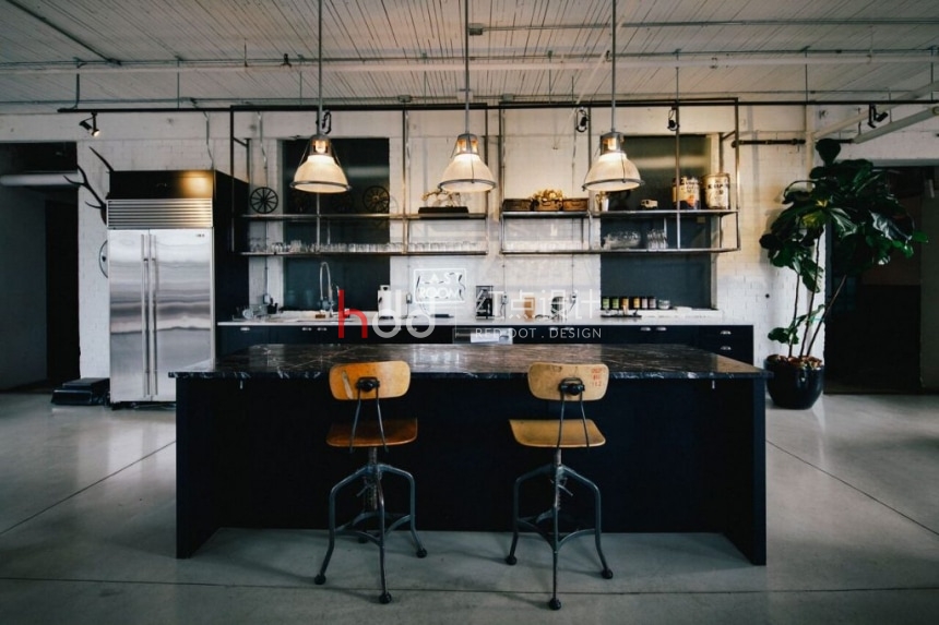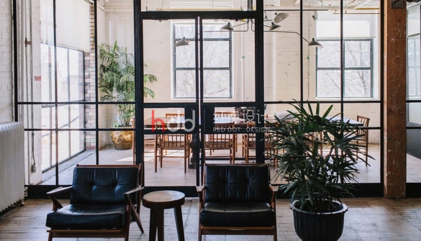 建筑內部風格保有工業時代的粗曠風格,不加以修飾的天花板,直接讓管線裸露在外,搭配上工業風的燈具,打造出獨樹一幟、卻不雕飾的舒適工作環境;地面采用木質地板,搭配上樸素材質的地毯;一旁正對著挑高的吧臺,另一角落的舒適沙發讓人忍不住坐上或小寐。