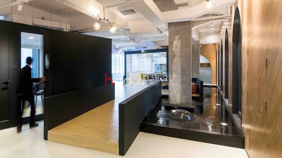 “蜻蜓島”是一個(gè)抬高平臺(tái),由三間討論室和一個(gè)休閑沙龍組成。空間概念上是設(shè)計(jì)一個(gè)與周圍環(huán)境脫離的獨(dú)立體量,從而提供一個(gè)遠(yuǎn)離辦公區(qū)的休閑場(chǎng)所。它被賦予了類似蜻蜓的平面造型,并放置在一個(gè)開放空間的水面上,從這個(gè)工業(yè)建筑框架主導(dǎo)的辦公空間中分離開來。被油漆成黑色的表面不表現(xiàn)任何材質(zhì)紋理,這種抽象性使它從周圍那些裸露的混凝土結(jié)構(gòu)柱以及木材質(zhì)感的景觀長(zhǎng)墻等元素中獨(dú)立出來,獲得輕盈漂浮的放松感覺。家具和燈具也經(jīng)過精心挑選,一同營造這種休閑氛圍。