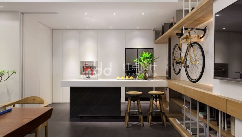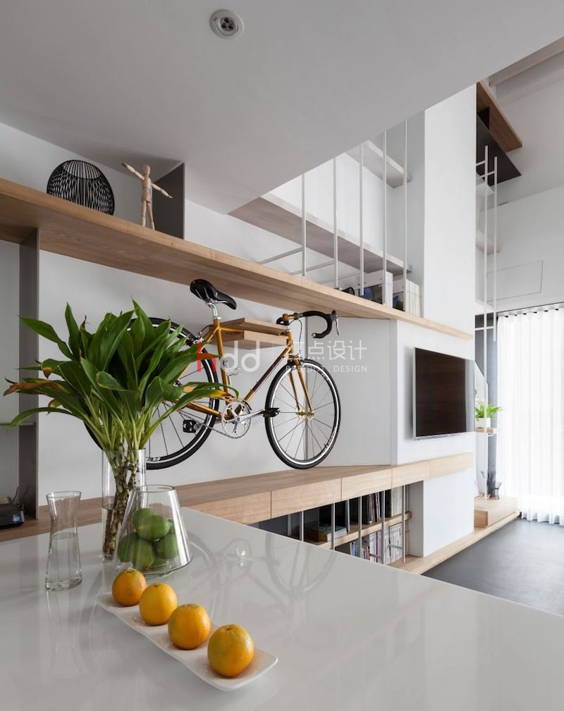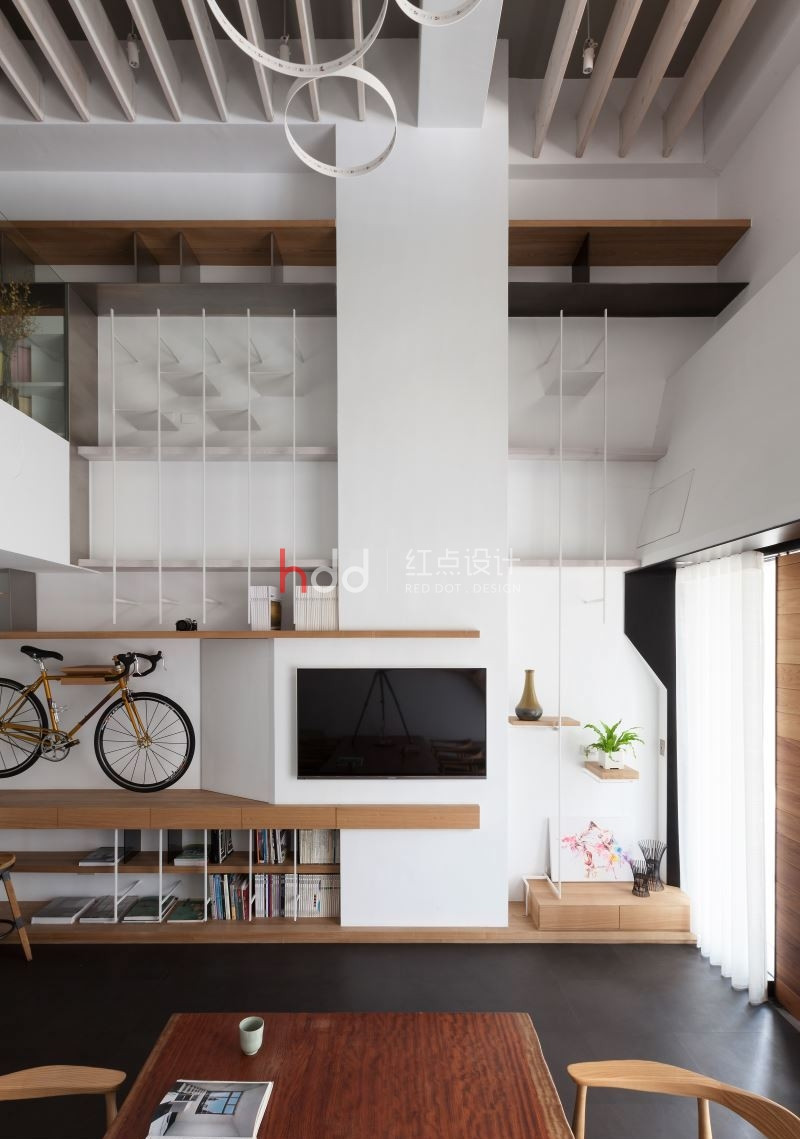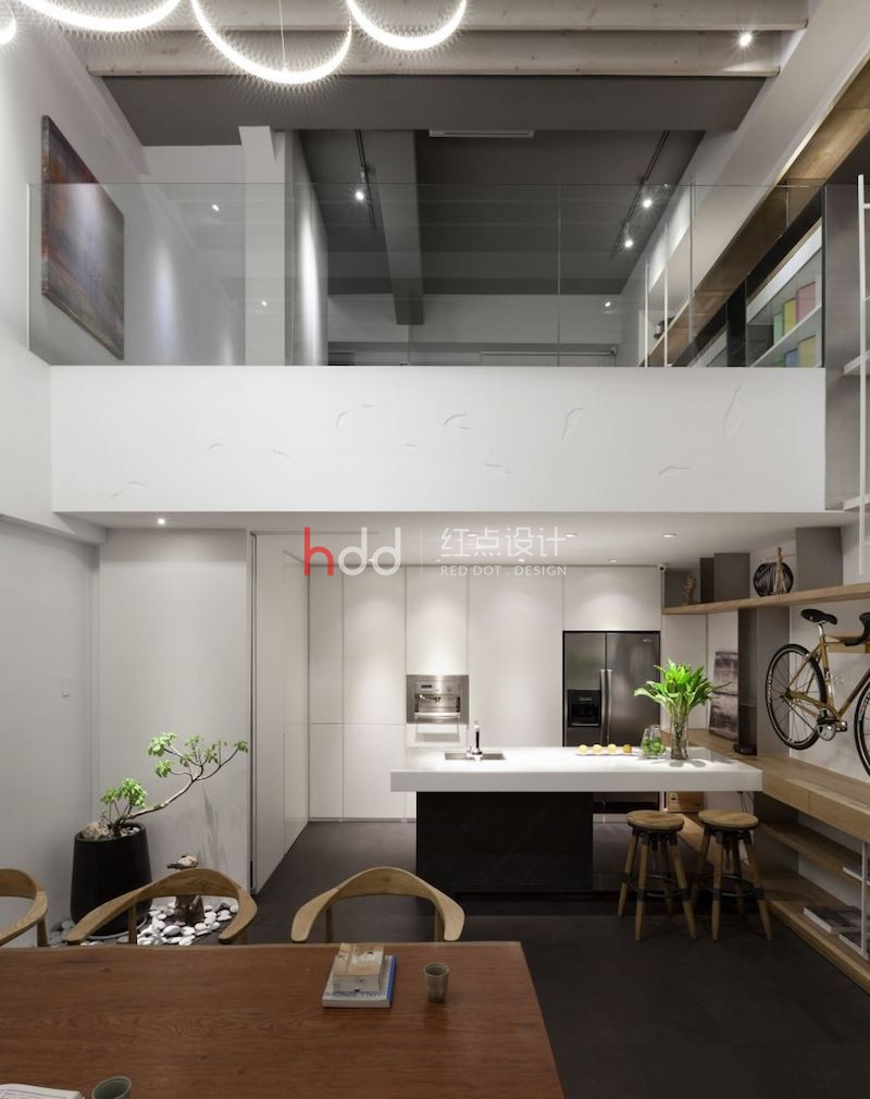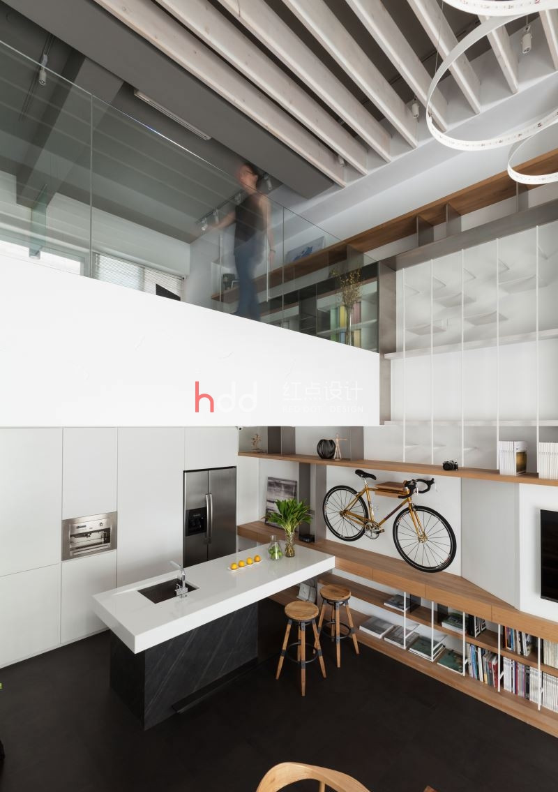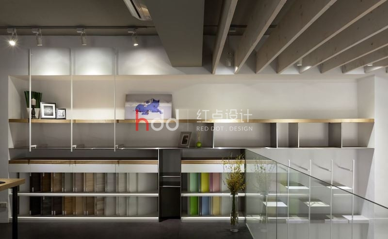 利用復(fù)層堆疊延伸尺度,富含更多樣化的想像可能,開(kāi)放式空間解構(gòu)格局的限制,輔以透光窗帶進(jìn)的明亮光照,在車(chē)水馬龍的市區(qū)中,開(kāi)拓一處溫煦、休閑的靈感沃土。 紅點(diǎn)建筑+室內(nèi)設(shè)計(jì)的辦公室,以白色作為舒適氛圍的基底,在清爽、明晰中,加入適度的木元素妝點(diǎn),增添溫潤(rùn)悠閑的特質(zhì)。整體空間利用開(kāi)放式設(shè)計(jì),包納辦公、會(huì)客及建材展示的多重機(jī)能性,并延伸中島、洽談,和夾層處的辦公桌,一旁的墻面納入收納展示機(jī)能,結(jié)合鐵件和木作,相互交錯(cuò)的層板、線(xiàn)條,延伸至二樓,形成獨(dú)特的端景墻,而挑空設(shè)計(jì)不僅放大了視野,也允許了不同視角的駐足、觀賞,讓靈感也能隨著開(kāi)闊的視域,更加自由靈活不受局限。