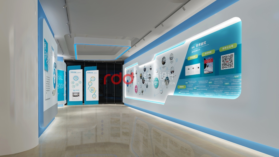 順著流線往里面走去,兩邊藍(lán)白相互輝映的造型墻正向參觀者講述著企業(yè)的過去與未來。仿佛徜徉在企業(yè)的海洋,述說著一個個精彩的歷史故事。