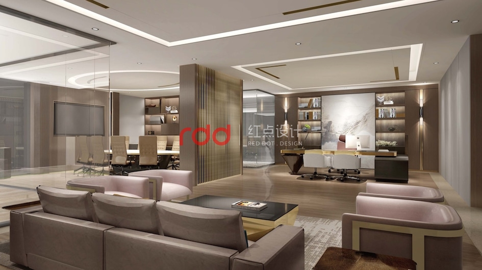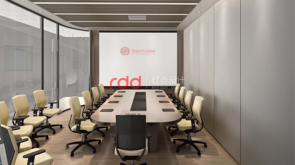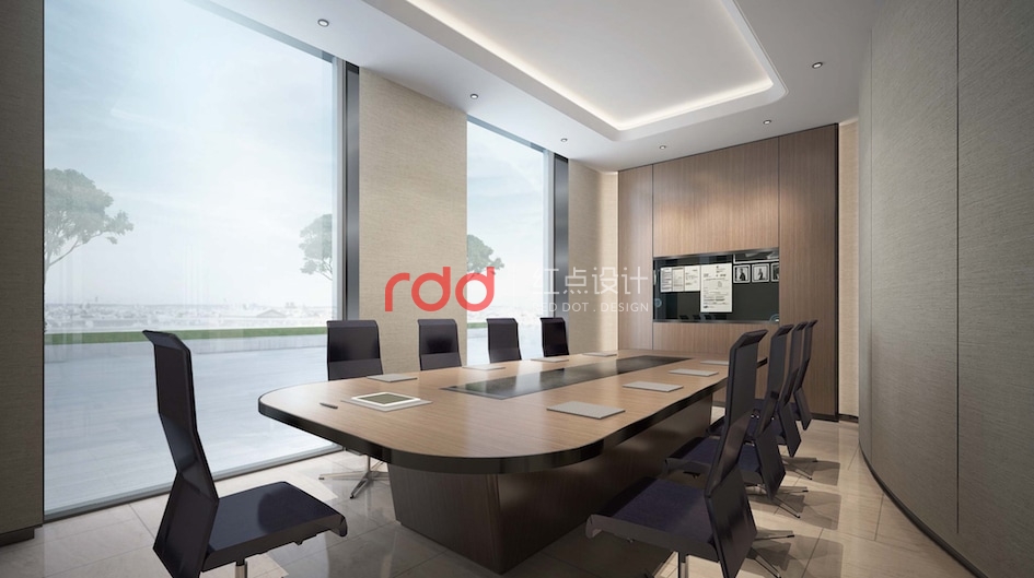 會(huì)議室及財(cái)務(wù)辦公室的工作氛圍是比較嚴(yán)謹(jǐn)?shù)模虼嗽谠O(shè)計(jì)上運(yùn)用比較常規(guī)的設(shè)計(jì)手法,家具的運(yùn)用上選用沉穩(wěn)大方暖木色家具,條形鋁格柵從室外一直延伸到室內(nèi)。