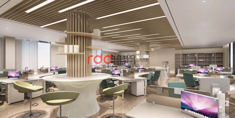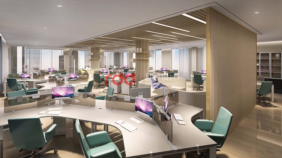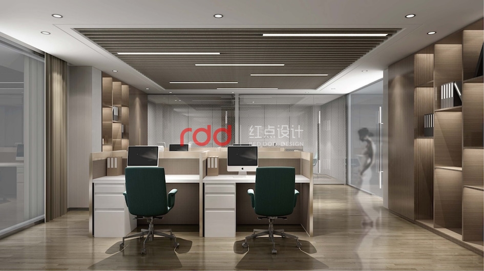 通過對(duì)二層辦公區(qū)動(dòng)線分析,紅點(diǎn)裝飾設(shè)計(jì)的設(shè)計(jì)師以多邊形為元素,在開放辦公區(qū)運(yùn)用不同多邊形拆分、組合,形成一個(gè)相對(duì)活躍的辦公空間,仿木紋鋁格柵從天花一直延伸到立面,圍合成一個(gè)半開放半私密的環(huán)境,藍(lán)綠色的椅子為點(diǎn)睛之筆,讓整個(gè)空間增添了幾分樂趣。