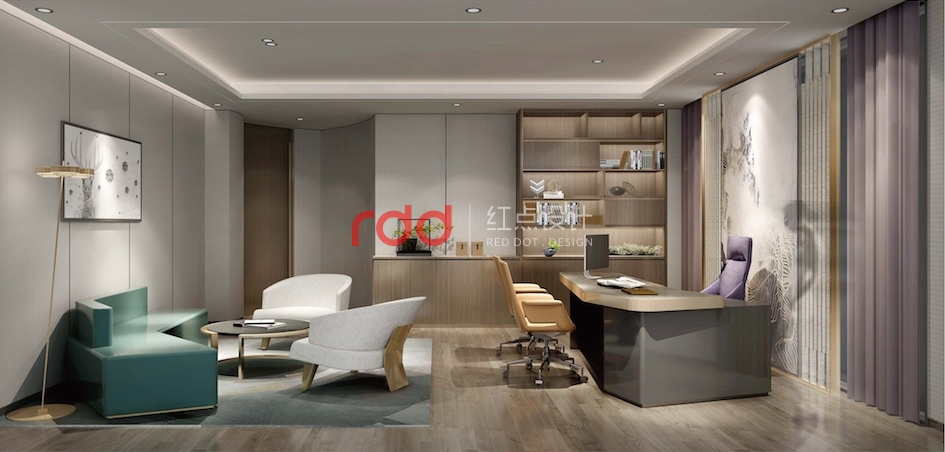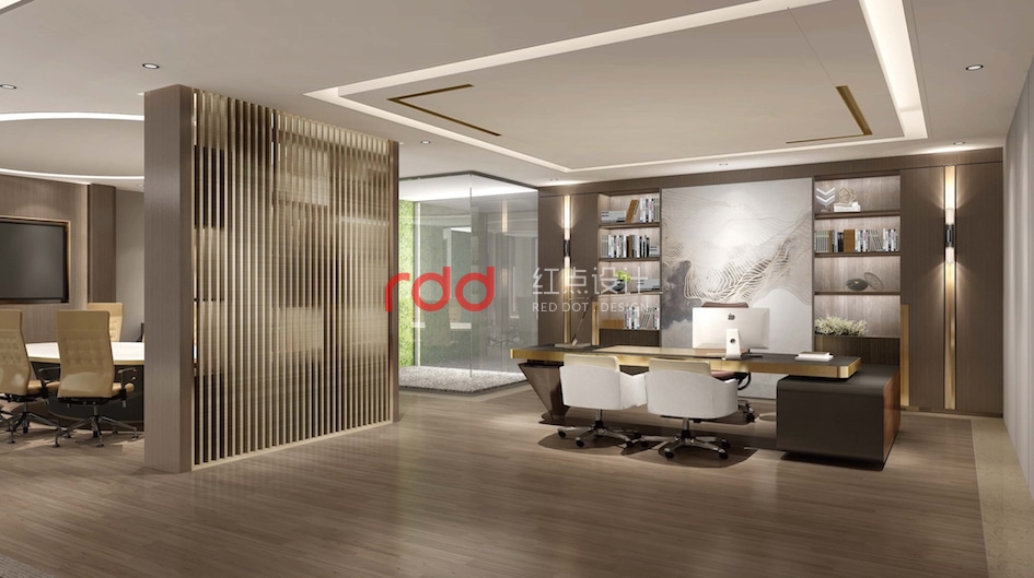 CEO辦公室是三層的重點(diǎn),整個(gè)辦公室內(nèi)辦公、接待、會(huì)議功能俱全,加上陽臺(tái)及端景的戶外休閑空間就更加完美了。會(huì)議室與辦公區(qū)運(yùn)用柜子及格柵來形成一個(gè)既開放又相對(duì)獨(dú)立的空間。辦公桌后面的柜子具有收納功能的同時(shí)也兼具裝飾的的效果,這樣的布局在風(fēng)水上有背山靠水,春暖花開之意。