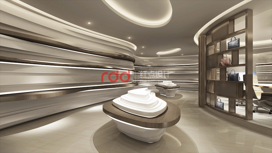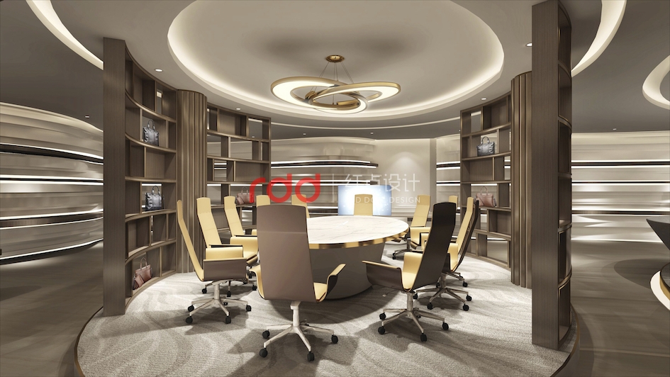 會(huì)議區(qū),橢圓的造型天花與橢圓的會(huì)議桌相互呼應(yīng),旁邊還有酒柜及端景區(qū), 經(jīng)過瘋狂的頭腦風(fēng)暴以后,欣賞著窗外的美景品嘗著美酒,這也不失是一份忙里偷閑的愜意享受。